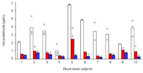 | Figure 3: Hexanaldehyde emitted in the bioreactor headspace of neutrophils (red bar) and PBMCs (blue bar) following 24 h of incubation are presented. X represents replicates. The hexanaldehyde concentrations are significantly lower from neutrophils and PBMCs compared to media (white bar). |
