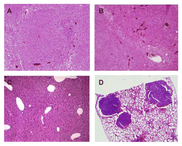 | Figure 6: Histological sections of liver tumors, pre-malignant livers and lung tumors of knock-out mice. A: Nodular hyperplasia of hepatocytes in neil1–/–mice; B: hepatocellular carcinoma in nth1–/– mice; C: Severe hepatocellular dysplasia in neil1–/–/nth1–/– mice; D: lung tumors in neil1–/–/nth1–/– mice (from ref. [137]). |