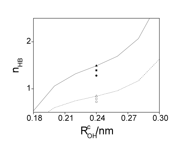 | Figure 9: The mean numbers of hydrogen bonds per oxygen atom (line) and per hydrogen atom (dashed line) as a function of H…O distance cutoff OHRC ( Å) as well as results for three additional definitions (oxygen: closed, hydrogen: open; AD1: square, AD2: circle, AD3: triangle). The glycerol concentration is 5.59 M. |