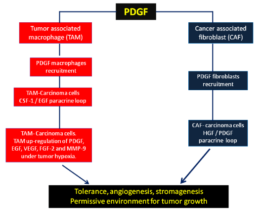 | Figure 3: PDGF interactions and cross-talk in tumorigenesis. As described for wounds, PDGF may create a favorable environment for macrophages and fibroblasts recruitment into the tumor parenchyma. Macrophages-secreted PDGF as by other cells within the tumor recruits more macrophages and activates fibroblasts creating and interactive networking that instructs both cells to act as key players in tumor promotion/progression. As described by Wickoff and Condeelis, a paracrine self-propagating loop is created between tumor macrophages and tumor epithelial cells so that the former secrete EGF, which is a positive stimulus for the malignant epithelial cells that express EGFR. In turn, carcinoma cells secrete CSF-1 which attracts macrophages and induces them to secrete more EGF, thus completing the loop. Another example of tumorperpetuating loop is given by TAM’s response to hypoxia, so that growth factors with special tropism for epithelial (EGF), stromal (PDGF, fibroblast growth factor: FGF), and vascular cells (PDGF and vascular endothelial growth factor: VEGF) are released; thus enhancing carcinoma cells survival, stromagenesis by fibroblasts activation and angiogenesis. In this context metaloproteases (MMP) are also released by macrophages which remodel tumor storma. PDGF is involved in another loop which connects CAF and carcinoma cells. CAF secrete hepatocyte growth factor (HGF) which enhances carcinoma cells proliferation and migration. These cells in turn secrete PDGF which is used as activating and mitogenic factor for CAF. |