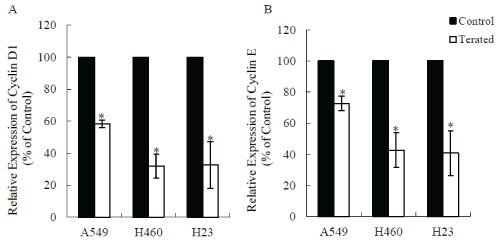 | Figure 3: Effects of HL on protein expression of cyclin D1 (A) and cyclin E (B) in NSCLC cells. Cells were incubated with 200 μM HL for 48 hours. Then, cell cyclerelated proteins were detected by flow cytometry.*Significantly different (p<0.05) compared with the controls (Student’s t-test); data are the mean ± standard error (n=3) from three independent experiments. |