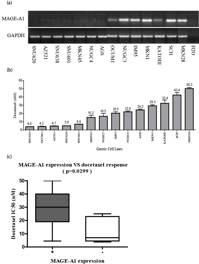 Figure 1: (a) mRNA expression MAGE-A1 in 14 gastric cell lines by RT-PCR. mRNA expression of GAPDH was used as the baseline. At least two independent experiments were preformed for each cell line. (b) MTS assay of 14 cell lines ranked according to their docetaxel response (IC50). Cells were treated with docetaxel over 72 hours. Experiments were performed in triplicates, and repeated in at least two independent experiments. (c) Box plots of GC cell lines based on MAGE-A1 expression and IC50 of docetaxel (n=14). 5 cell lines that had high IC50 to docetaxel (n=7), had MAGE-A1 expression. 5 cell lines that had low/intermediate IC50 to docetaxel (n=7) were no expression of MAGE-A1. *p=0.0299 is calculated by unpaired t test with Welch correction.