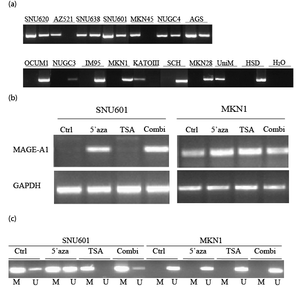 | Figure 7: (a) DNA promoter methylation status of MAGE-A1 in 14 gastric cell lines by MSP. The presence of both methylation and unmethylation bands was considered as methylation. UniM: Universal methylated DNA is the control for methylation; HSD: human sperm DNA is the control sample for unmethylation. M: methylation; U: unmethylation. (b) mRNA expression and (c) methylation status of MAGE-A1 in cell lines treated with 5’aza and/or TSA. Cell lines with low docetaxel IC50 (SNU601) showed demethylation and re-expression of MAGE- A1 after 5’aza treatment but not in TSA. In contrast, MKN1 with high docetaxel IC50 showed no change in mRNA expression or methylation status in MAGE-A1 after all treatments. GAPDH expression was used as baseline. At least two independent experiments were preformed for each cell line. |
