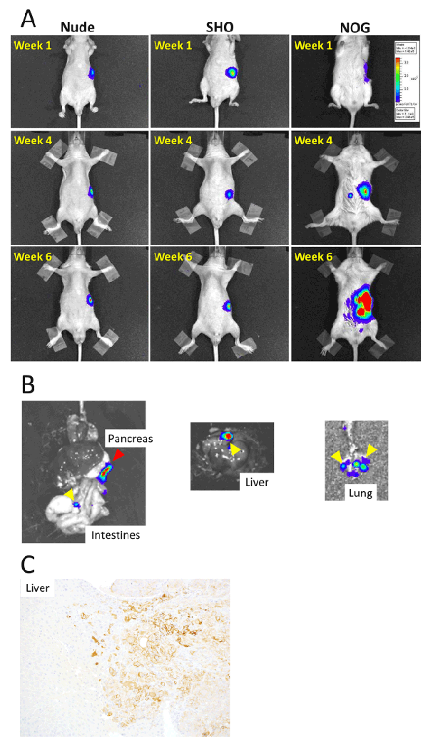 | Figure 2: (A) In vivo imaging of an orthotopic implantation model of pancreatic cancer in Nude (left), SHO (center), and NOG (right) mice. In Nude and SHO mice, the size of the luminescence from tumors implanted in the pancreas remained unchanged during the experimental period. On the other hand, the luminescent signal in NOG mice expanded over the week. (B) Ex vivo imaging of internal organs of the NOG mouse showed bioluminescence signals in the pancreas (left; red arrowhead), intestines (left; yellow arrowhead), liver (center; yellow arrowhead), and lungs (right; yellow arrowheads). (C) The immunostaining of HLA class I-A,B,C clearly highlighted the nest of human cancer cells in the liver of the NOG mouse. Original magnification, ×200. |