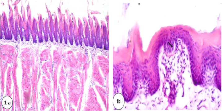 | Figure 1: Photomicrographs of the dorsal tongue surface of Sham group showing: (a) Sharp conical projections of filiform papillae with thin smooth keratinized epithelial covering (H & E X 100 ). (b) Fungiform papilla and taste bud (arrow) (H & E X 200). |