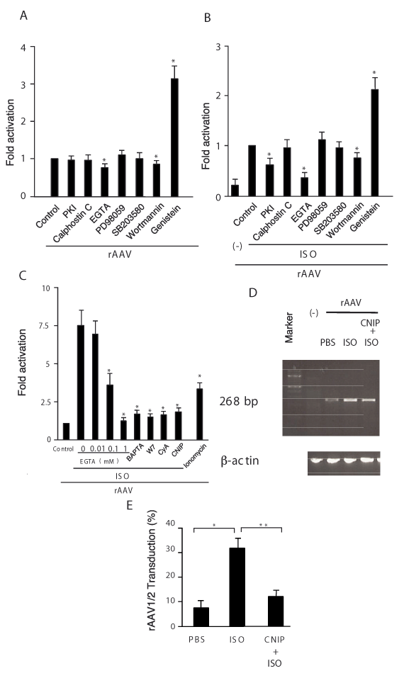 | Figure 3: The calcium signalling cascade mediates the ISO-increased rAAV transduction. The fold activation of rAAV transduction is indicated following preincubation with: 100µM PKI, 1µM calphostin C, 1µM EGTA, 50µM PD98059 (PD), 10µM SB203580 (SB), 0.1µM wortmannin or 20µM genistein with (A) or without 10-5 M ISO (B) in H9C2 cells cells compared with control. Data are meanħSEM, *p<0.05 (n=4). (C) The fold activation of rAAV transduction is indicated following preincubation with the indicated concentration of EGTA, 10µM BAPTA-AM, 0.1µM W7, 500 ng/ml cyclosporin A (CyA), 500µM calcineurin autoinhibitory peptides (CNIP), 1µM ionomycin in H9C2 cells compared with ISO alone or control. Data are meanħSEM, *p<0.01 (n=4) vs. ISO alone, **p<0.01 (n=4) vs. PBS control. (D) Inhibition of calcineurin by CNIP suppresses rAAV transgene expression as shown by RT-PCR analysis of lacZ gene expression. β-actin control expression in the cells is shown. (E) Abrogation of ISO-increased transduction of pseudotype rAAV1/2 vectors following CNIP incubation in H9C2 cells. Data are meanħSEM, *p<0.05 (n=4) vs. PBS control, **p<0.05 (n=4) vs. ISO alone. |