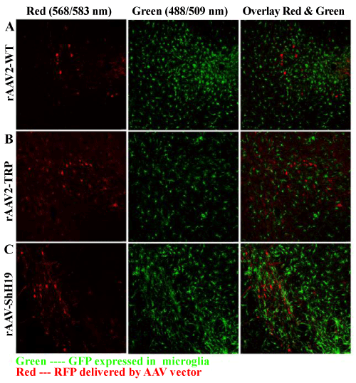 | Figure 4: In vivo transduction of normal brain. Confocal microscopy images of sections of normal brain (no tumor) after AAV vector injections into C57BL/6 CX3CR1/ GFP mice (which expresses GFP in their microglia). Original magnification: 200x. A. rAAV2-WT-CBA-RFP. B. rAAV2-TRP-CBA-RFP. AAV2-TRP is AAV2 capsid with Y(444, 500, 730)F tyrosine mutations (“triple mutant”). C. rAAVShH19- CBA-RFP gene transfer. |