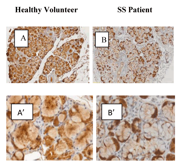 | Figure 8: Immunohistochemical studies of GCDFP-15/PIP in sections derived from SS biopsies and healthy volunteer. In healthy volunteer the staining is more concentrated towards the apical pole of mucuse cells (acinous marked with m in figure 8A’) and ductal cell are negative, is also possible observe some immunorective material in the lumen of mayor ducts (asterisk in figure 8A). In SS patients the immunoreactivity for GCDFP-15/PIP is faint in mucus acini (see m in figure 8B’), no major changes were observed in serous acinar cells but slightly increase in the intensity of the immunoreactivity in this cells. |