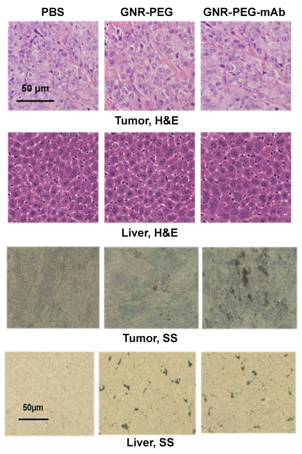 | Figure 10: Above: Hematoxylin & Eosin (tumor and liver), and Below: silver staining (tumor and liver) of GNR accumulated in mouse tissues following intravenous injection of PBS, GNR-PEG or GNR-PEG-HER2 conjugates. Silver staining shows that GNR peg or Ab conjugates have uniform distribution in liver and noticeably higher number of GNR specific conjugates in mouse tumor. |