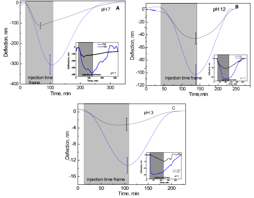 | Figure 3: Average deflection of HSA immobilized cantilever (blue) and reference PEG12-CL SAM immobilized cantilever (black) upon injection of 100 mM CoCl2 at various pHs A) pH 7; B) pH 12; C) pH 3. The signals are filtered from noise by smoothening and baseline adjustment is done by subtracting a straight line in Origin Pro 8 (graphing and data analysis software). Inset shows the unfiltered cantilever signals. |