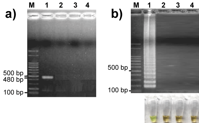 | Figure 5: Comparative analysis of the specificity of LAMP and PCR (a) Electrophoresis analysis of PCR; (b) Electrophoresis analysis and visual detection (SYBR Green I) of LAMP. Left to right: lane M, DNA size marker (100 bp; Fermentas); lanes 1 PVY; lane 2 PLRV; lane 3 CMV; lane 4 negative sample. |