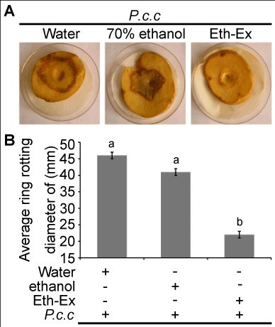 | Figure 3: The effect of the ethanolic extract from S. baicalensis on the development of soft rot disease on potato caused by P. carotovorum subsp. Carotovorum. P.c.c., P. carotovorum subsp. Carotovorum; Eth-Ex, the ethanolic extract from S. baicalensis; A, the development of soft rot disease on potato caused by P. carotovorum subsp. Carotovorum. B, Inhibition of QSmediated plant disease. Data are presented as mean ± SD. |