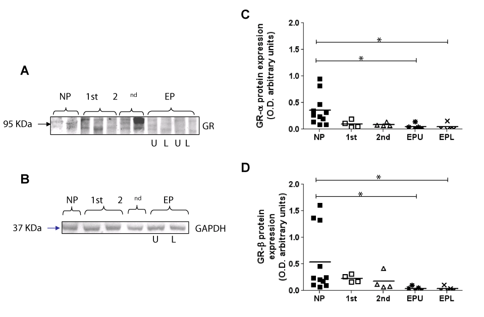 | Figure 3: Pregnancy induced changes in GR expression in human myometrium. Immunodetection of GR protein expression in non-pregnant (NP), first trimester (1st), second trimester (2nd), and preterm labouring (EP) human myometrium. Upper (U) and lower (L) uterine segment samples were examined in the preterm labouring group. Tissue homogenates were resolved by SDS-PAGE and the proteins detected using the BD laboratories anti-GR antibody. Two protein bands at 95 KDa (GR-α) and 90KDa (GR-β) were detected. A representative immunoblot is presented in A. To ensure equal lane loading and transfer efficiency, membranes were stained with Ponceau-S solution (not shown) and later re-probed with anti-GAPDH as an additional control. A representative control blot is shown in B. Immunodetected bands were quantified by scanning densitometric analysis, and densitometry graphs for GR protein shown in B. All samples are plotted within the allotted patient groups. The bars represent means. (GR-α protein: NP vs. EPU/EPL P<0.05; GR-β protein: NP vs. EPU/EPL P<0.05). The results are representative of the samples being used in three independent experiments. |
