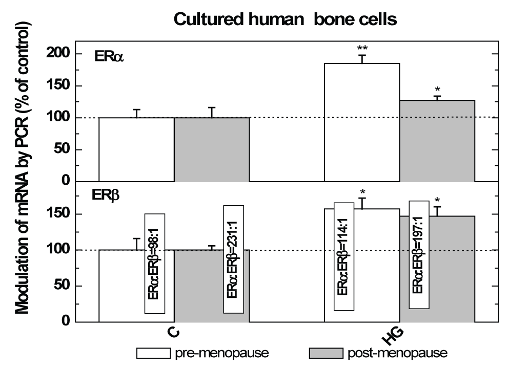 | Figure 1: Modulation by hyperglycemia of the expression of mRNA for ERa and ERb in primary human female- derived osteoblasts. Bone cells were obtained and cultured, and extracts prepared for real time PCR analysis as described in Materials and Methods. Results are means SEM for triplicate cultures from 5 donors for each group. Means of cells grown in high glucose (grey bars) were compared to cells grown in normal glucose (open bars): *, P <0.05; **, P <0.01. |
