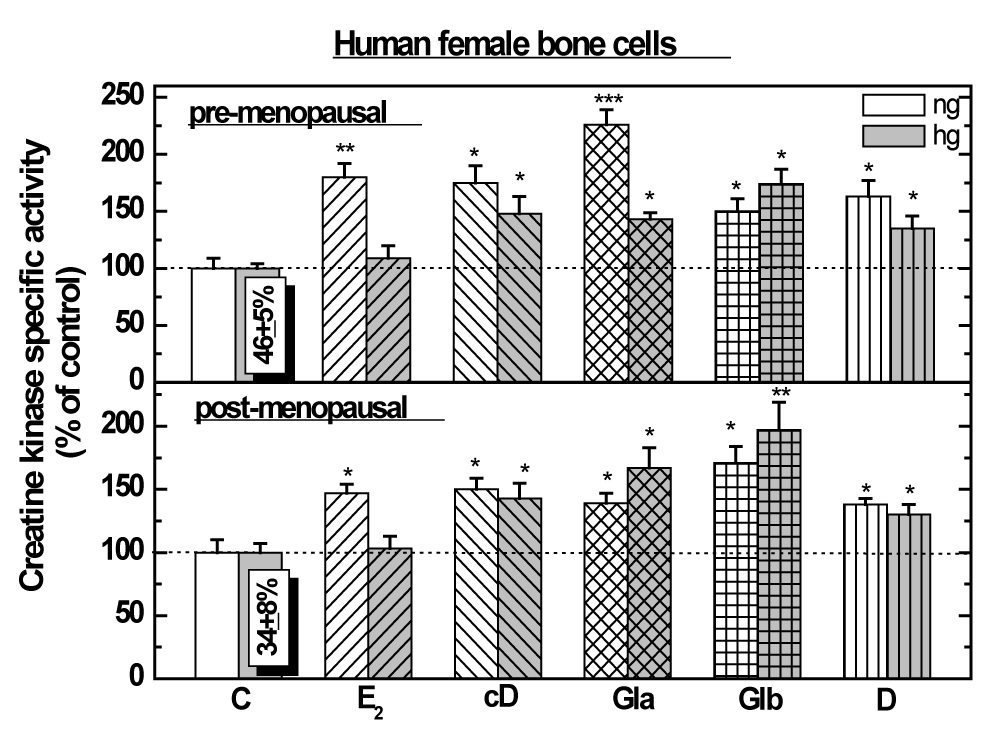 | Figure 3: Stimulation of DNA synthesis by the different phytoestrogens and E2 in primary bone-derived cells from pre- and post-menopausal women, grown at different glucose concentrations either normal (4.5g/L; 22mM light) or high (9.0g/L; 44mM gray bars) glucose concentrations. Bone cells were cultured, treated and assayed for CK activity as described in Materials and Methods. Cells were treated for 24h with vehicle or 30nM E2 or 300nM of cD, Gla or Glb or 3000nM of D. Results are means ± SEM for triplicate cultures from 5 women/ group for each group. Control means of CK specific activity were 3870± 350 and 3460± 400dpm/well, for pre- and post-menopausal women respectively. Experimental means compared to control means: *, P <0.05; **, P < 0.01; ***, P < 0.001. Means of cells at HG+ estrogenic compounds vs. cells at NG+ estrogenic compound: #, P <0.05; ##, P < 0.01. |