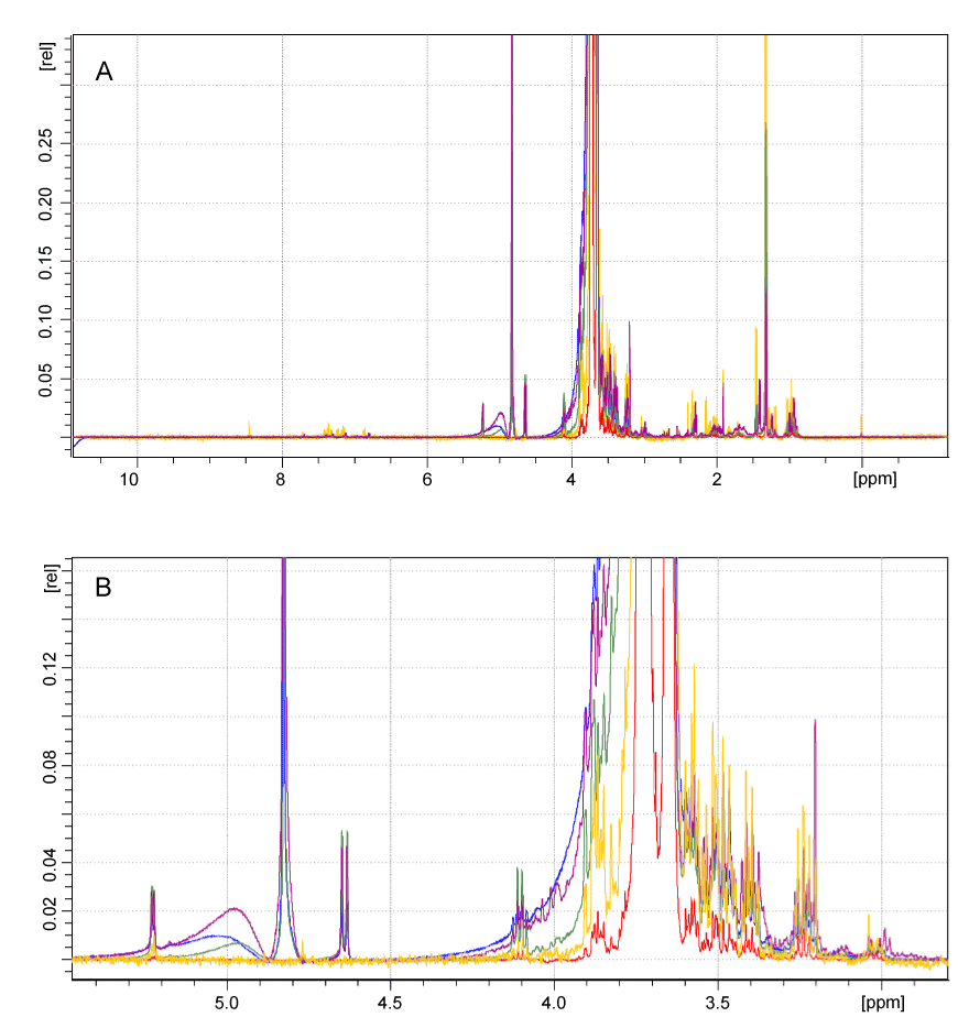 | Figure 1: Comparison of different proton spectra of 5 selected infected samples. A) The overview of the superimposed spectra shows several regions in which the samples differ a lot. Those regions were excluded in the following PCA analysis. B) The glucose region of the spectra shows the dramatic effect of this signal on the overall aspect of the spectra. Based on this signals the spectra were classified, and the results are shown color-coded: red and yellow are good spectra, green is the limit for classification. Blue and violet can not be used, and later the PCA models classify them as out of the model. |