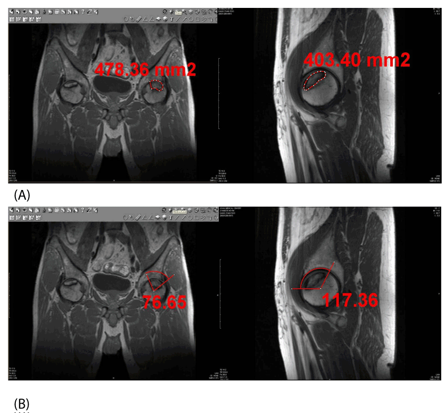 | Figure 1: 48-year-old male with osteonecrosis of the both femoral heads. To check amount of osteonecrosis we evaluated T1-weighted coronal and sagittal MR image. (A) Absolute value of the osteonecrosis was evaluated by the tool measuring size in the PACS. (B) Necrotic angle of the osteonecrosis was evaluated by the tool measuring angle in the PACS. |