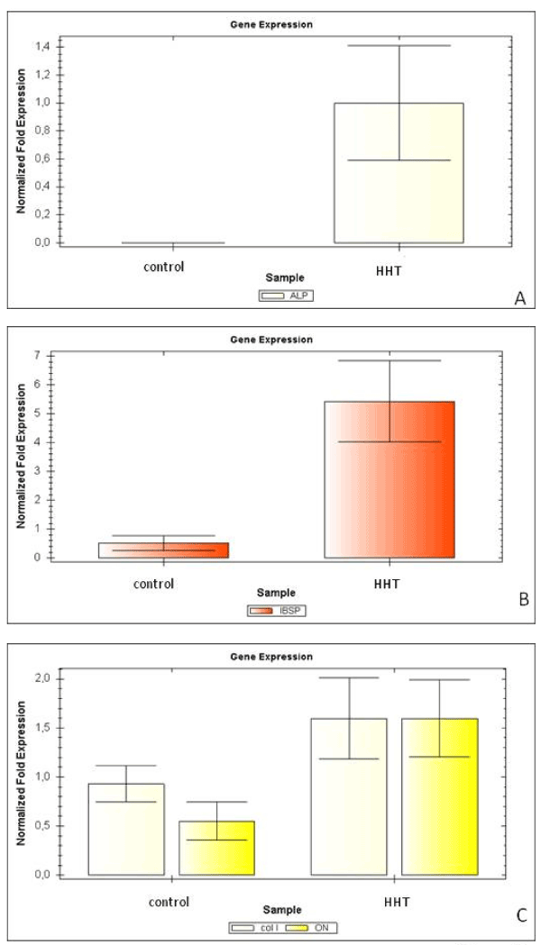 | Figure 9: Real time PCR analysis of relative expression of the indicated genes after 40 days in osteogenic medium; a) ALP, b) IBSP, c) COL I and ON (arbitrary units). Gene expressions were normalized to PGK (Phosphoglycerate kinase) gene expression. Each sample was analyzed in triplicate, all the p-values were <0.001. |