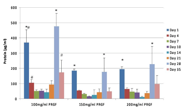| Figure 3: Quantification of generic protein released from pure PRGF scaffolds over 35 days. *indicates significant differences, p < 0.05, for days 1 and 28 when compared to all other time points for each material, but not each other. #indicate statistically significant differences, p < 0.05, between days 1, 4, and 35 when compared to other time points, but not each other. Minimum level of detection was 17 μg/ml. |