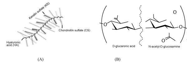 | Figure 3: (A) A proteoglycan aggregate illustrating a collection of proteoglycans attach to a hyaluronic backbone. PGs are the bottlebrush-like structures comprising of a protein core with side chains of CS and KS [54] (B) Structure of hyaluronan [55]. |