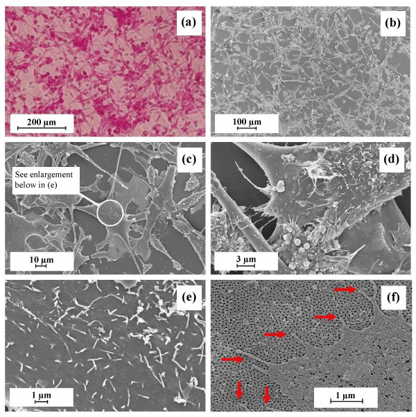 | Figure 3: a) Optical microscopy of MDCK cells on in-house AAO membrane; b) FESEM image of cells on in-house AAO membrane; c) and d) detailed image of cells on AAO membrane; e) enlargement of cell membrane showing microvilli; and f) enlargement of cell membrane showing the presence of filopodia (red arrows). Scale bars shown on each image. |