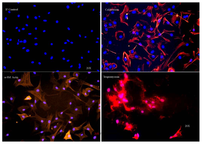| Figure 1: Phenotypic confirmation of primary vaginal cells. Cells isolated by enzymatic digestion of vaginal biopsies were proliferated in DMEM/12 containing 20% v/v FBS. Cells positively labeled for various SMC markers, such as caldesmon (Alexa Fluor 594, red), a–SM actin (Alexa Fluor 555, orange), and tropomyosin (Alexa Fluor 594, red) confirming the SMC phenotype. Nuclei were labeled with DAPI (blue). |