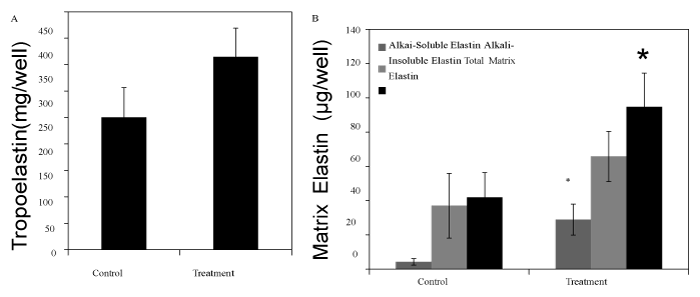 | Figure 4: Effects of EFs on elastic matrix synthesis by VSMCs after 21 days of culture. (A) Tropoelastin measured from spent media aliquots. (B) Matrix elastin quantified from cell layers represented in terms of alkali–soluble elastin, alkali–insoluble elastin, and total matrix elastin (soluble+insoluble). Addition of EFs resulted in a 2.6 ± 1.4 (p=0.004) fold increase in total matrix elastin, primarily in the form of soluble matrix elastin (p=0.04). ‘*’ represents significant difference from comparable control for (p<0.05). |