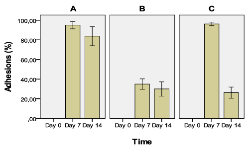 | Figure 1: Adhesions (%) evaluated at day 7 after surgery and day 14 after adhesiolysis in group A receiving NaCl before and after adhesiolysis, group B receiving PL/PG before and after adhesiolysis, and group C receiving NaCl before and PL/PG after adhesiolysis. Significantly, less adhesions at day 7 and 14 in group B compared to group A (p<0.05). There were significantly less adhesions at day 7 and 14 in group C (p<0.05). Graphs show adhesions (mean) ± SE. |