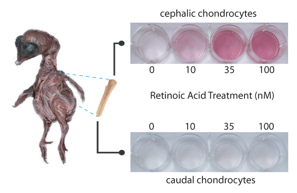 Chondrocytes were removed from the cephalic and caudal region of 14 day chick embryos, cultured in monolayer and treated with retinoic acid (RA, 10, 35, and 100 nM) to induce maturation. Photomicrographs of cells stained for alkaline phosphatase, show a dose dependent increase in this maturation marker (see increase in red color), only on cephalic chondrocytes. |