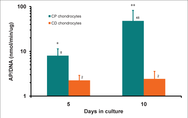 | Figure 4: Alkaline phosphatase activity increases in CP chondrocytes culture in chitosan sponges. CP and CD chondrocytes were cultured in chitosan sponges for 5 and 10 days, ALP activity was measured spectrophotometricaly, and normalized to the total DNA content of each sample. ALP activity exponentially increased in CP chondrocytes, while in CD chondrocytes, no significant changes where observed. *Significant difference from CP chondrocytes at day 5. **Significant difference from CD chondrocytes day 10. |