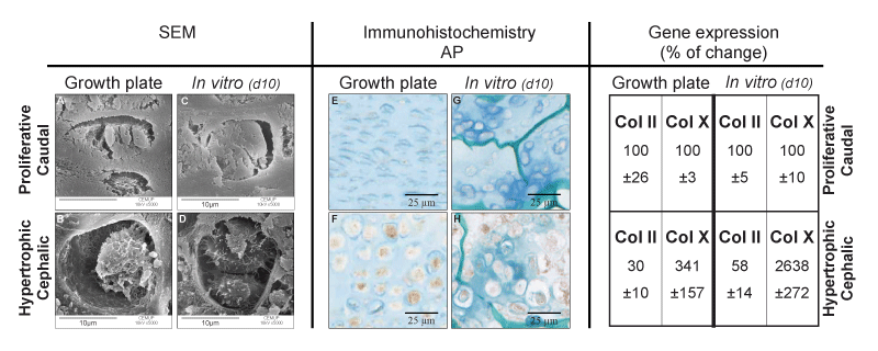 CP and CD chondrocytes were cultured for 10 days in chitosan sponges, and samples collected for SEM, ALP immunostaining and Real time RT-PCR, using primers specific for chick genes. 19 day chick embryo tibia growth plates were analyzed in the same manner. Note the similar morphology of chondrocytes in the growth plate, and in the chitosan. Positive ALP staining is present in hypertrophic chondrocytes in the growth plate and CP cells in culture. Gene expression profiles are also similar in hypertrophic cells in the growth plate and the CP cells in culture. Expression levels are presented as “fold change” in mRNA levels in CP chondrocytes, when compared to CD chondrocytes or hypertrophic chondrocytes compare to proliferative. All values were significantly different. |