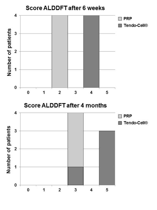 | Figure 5: Histograms represent the number of patients, and the different scores they received from the veterinary practitioners (0-5), at approximately 6 weeks and 4 months after treatment of their accessory ligament of the deep digital flexor tendon (ALDDFT). At 6 weeks after treatment with platelet-rich plasma (PRP), all 4 patients (light grey) received a score 2/5. At the same time point, all 4 Tendo-Cell® treated patients (dark grey) received a score 4/5. At 4 months after PRP treatment, all the patients received a score 3/5. Although 1 of the Tendo-Cell® treated patients received the same score, the other 3 patients received a score 5/5. |