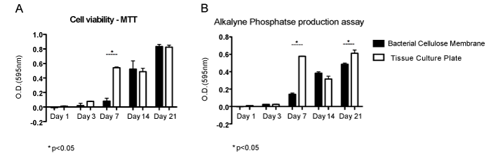 | Figure 1: Evaluation of in vitro BC’s membrane biocompatibility with human adipose tissue-derived mesenchymal stem cells. During the period evaluated, hASC cultured on BC membrane could achieve the same levels of MTT methabolization capacity-at day 14 and day 21: (A) as well as alkaline phosphatase production-day 14: (B) compared to standard culture conditions. |