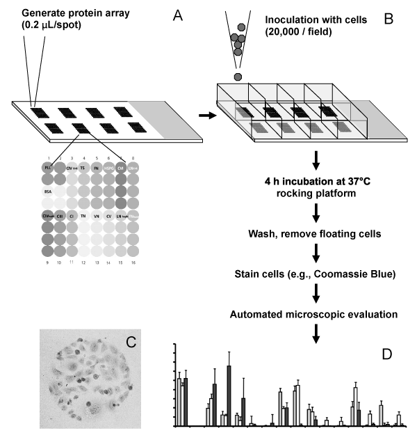 The basic concept of a multiple substrate array screen to investigate long-term interactions of cells on either different proteins, or on serial dilutions of a given protein, or combinations thereof, is outlined in a simplified graph. Protein arrays were generated by a micro blotter on NC-coated glass slides (A). Remaining NC was blocked by StabilGuard®, and cell culture chambers were generated by a silicon frame. Cells were added in DMEM medium (B) and incubated as indicated. After removal of floating cells, cells binding to the spots on the array were stained (C) and counted by an automated process (D). Technical details can be found in the original work published recently [22]. |