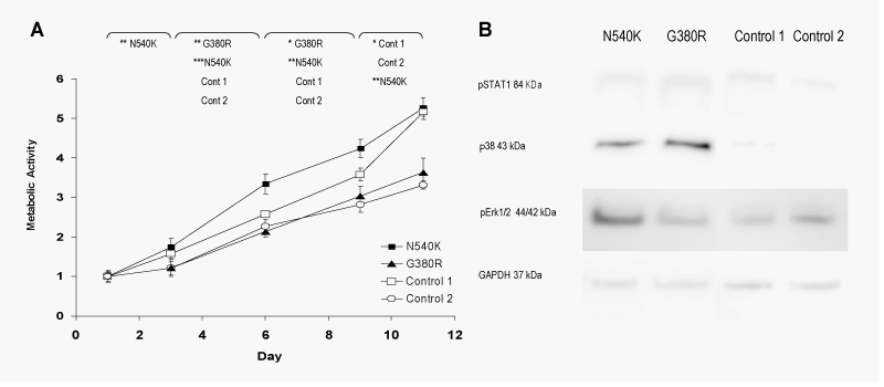 | Figure 1: Metabolic activity and affected signalling pathways. A, Metabolic activity was measured where FGFR3 mutant N540K displayed highest metabolic activity until day 11. The G380R mutant displays a similar profile as its matched control, control 2. All cell populations keep a growth curve until day 11 when confluence is reached. B, Signalling pathways affected by FGFR3 mutants indicate similar phosphorylation of STAT-1 in all cell populations. Signalling through MAPK-pathway members display elevated phosphorylation of Erk-1/2 in both mutants, significant activation in N540K. Induced phosphorylation of p38 was displayed in both N540K and G380R mutants can be seen compared to control populations. |