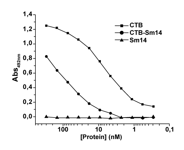 | Figure 5: GM1 binding activity by GM1-ELISA assay. In order to verify the ability of the protein pentamers to bind GM1 gangliosides, a GM1-ELISA was performed using recombinant CTB-Sm14, CTB or Sm14. The ELISA was performed by coating a 96-well plate with GM1. |