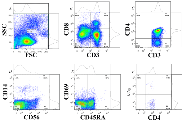 | Figure 1: Quadrant gating method. Representative dot plots are shown for the gating strategy used. A: Live cells were selected by a square gate in the forward and side scatter plot as to exclude anomalous cell particles. B: CD3+ and CD8- populations were selected. C: CD4+ populations were selected. D: Then, CD56- and CD14- populations were selected. This population number (CD3+/CD8-/CD4+/CD56-/CD14-) was used as the total CD4+ T-cell count. E: CD45RA- and CD69+ populations were selected. F: Various cytokines and other markers (such as IFN?) were plotted against CD4+ and cell population percentages were used for data analyses. |