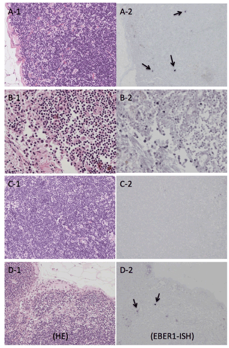 Hematoxylin-eosin stained histologies (A-1, B-1, C-1 and D-1) and EBER-1 expressions (A-2, B-2, C-2 and D-2) in lymph nodes were shown. A-1, C-1, and D-1: No abnormalities were found in HE stained specimens. ISH revealed that a few EBER-1-positive lymphocytes had infiltrated into the lymph nodes of the control and L-143rabbit (A-2 and D-2, arrows), but no EBER-1 expression was detected in the lymph nodes of rabbit O-21 (C-2). For the lymph nodes from rabbit O-19 that died on day 42, there was a trend for degeneration combined with an increase in macrophages (B-1) and an unexpected increase in the number of EBER-1-positive lymphocytes(B-2). Original magnification was×200 in B-1 and B-2, and ×100 in the others. |
