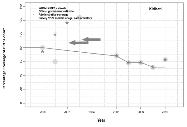 | Figure 3: Hepatitis B birth dose coverage for Kiribati: preliminary estimates based on country-reported coverage using interpolation for unreported years. The arrows show years where BCG coverage was below country-reported HepB birth dose coverage (88% in 2002 and 91% in 2003). |