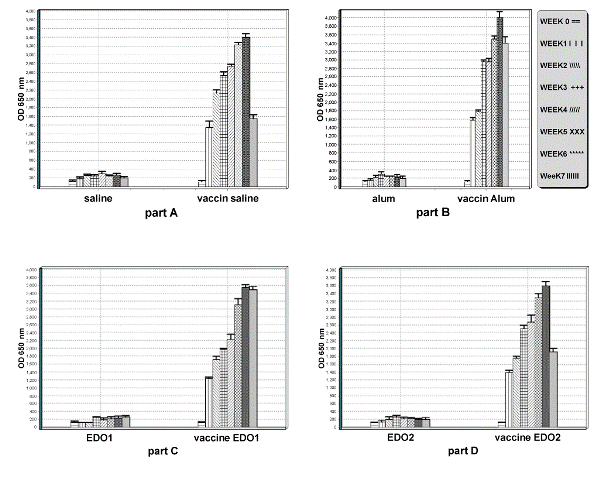 | Figure 1: Each column represents the serum antibody within a week. The first column indicates zero weeks and the last column is the seventh week. Part A: Comparison of serum antibodies in the vaccine without adjuvant. Part B: Comparison of serum antibodies in the vaccine with Alum adjuvant. Part C: Comparison of serum antibodies in the vaccine with EDO1 adjuvant. Part D: Comparison of serum antibodies in the vaccine with EDO2 adjuvant. |