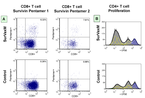 | Figure 3: A) Flow cytometric analysis of pentamer binding (HLAA* 0201) to human survivin-specific CD8+ T cells stimulated ex vivo with SurVaxM. Specific reactivity of CD8+ T cells to two different survivin epitopes but not control peptide are shown (upper right quadrants are CD8+/Pentamer+). B) Flow cytometric measurement of CD4+ proliferation via CFSE dye mitotic distribution in response to ex vivo stimulation with SurVaxM. As CD4+ cells proliferate, CFSE intensity decreases as dye is redistributed among daughter cells. Stimulation was without added peptide (Control) or with SurVaxM peptide. Grey, raw data; black line, computer curve fit; blue, undivided cells; yellow line, multiple proliferative generations. Data acquisition using BD LSRFortessa and analysis using FCS express v4. [anti-survivin custom pentamer (ProImmune, Oxford, UK) and CFSE (Invitrogen-Molecular Probes, Eugene, OR)]. |