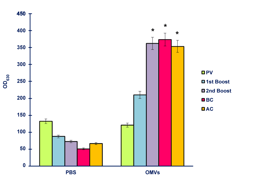 | Figure 2: Induction of humoral immune response induced by Leptospira OMVs. OMVs specific total serum IgG was measured by indirect ELISA as described in Section 2 (OD630=0.1). Hamsters were immunized with PBS (negative control) or OMVs. Sera were collected via the saphenous vein on day 0; PV= pre-vaccination, day 21; 1st boost=before first boost, day 42; 2nd boost=before 2nd boost, day 63; BC=before challenge and day 84; AC=after challenge. Bars represent the mean of eight hamsters per group ± standard errors of the means. (*p-value< 0.05). |