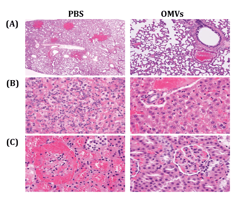 | Figure 5: Histopathological analysis of lung, liver and kidney from hamsters inoculated with PBS or OMVs at 21 days post L. interrogans serovar Pomona challenge. All tissues were fixed in 10% neutral formalin buffer, sectioned at 5 um and stained with hematoxylin and eosin. Left panel; tissue sections from control group. Right panel: tissue sections from hamsters immunized with Leptospira OMVs (A) Lung. Severe alveolar hemorrhage disseminated throughout the lung was found in animals in the control group. Lungs from OMV vaccinated hamsters were within normal limits. (B) Liver section. Moderate to severe hepatitis with mixed inflammatory cell infiltrates was evident in the control group. Note the unaffected liver from a vaccinated hamster. (C) Kidney section. Severe, acute, tubulointerstitial nephritis with locally extensive hemorrhage in uriniferous spaces and tubules was present in all kidneys collected from PBS-immunized hamsters. The kidney from an OMV vaccinated hamster is unaffected. |