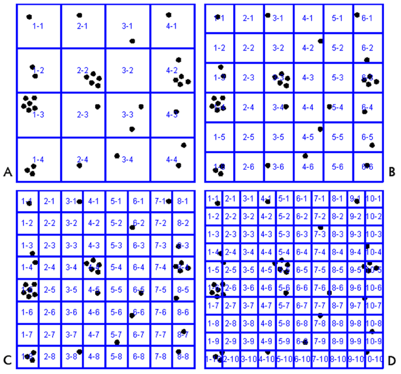 | Figure 4: Evaluation of grid dimensions to optimize quadrat sizes. Shown are index images of the landscape with annotated lattices of A) 4 × 4, B) 6 × 6, C) 8 × 8 and D) 10 × 10 grid overlays. The 8 × 8 grid produced the optimized quadrat dimensions. |