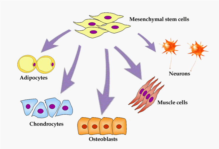 | Figure 1: Differentiation potential of mesenchymal stem cells. MSCs can differentiate in a large variety of human tissues including osteogenic, chondrogenic, adipogenic and neuronal lineages. Recently, it was also demonstrated the presence of human MSC-like cells in adult skeletal muscle. |