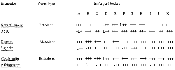 | Figure 12: Differentiation of embryoid bodies, as the means to determine pluripotency, was conducted for the cells acquired from the primary tumors of the patients diagnosed with the embryonal carcinoma of the testes (huECT bio) (the patients encoded 001-009, which are labeled in this figure as A-I respectively) and the cultured human embryonic stem cell lines (H1, H13 huESC cc, as J-K). Expression detected: +; no expression detected: -; lost sample: L. |