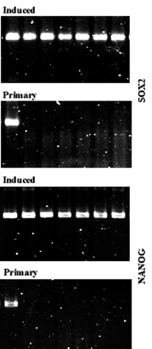 | Figure 8: Gene expression of OCT4 and NANOG of the human induced pluripotent stem cells was determined by quantitative reverse transcription polymerase chain reaction (qRTPCR). The cells expressing SSEA-4, SSEA-3, TRA-1-60, and TRA-1-81 were isolated from the induced cultures by magnetic activated cell sorting. The patients’ (encoded C001-005) cardiac or skin fibroblasts (lanes 3-7) were cultured (Primary) and induced into pluripotency (hiPSCs), while the human embryonic stem cells H1 (lane 1) and human fibroblasts IMR90 (lane 2) were the controls. All the samples were run in triplicates. The data are representative to all the samples run. The total RNA was isolated, reverse transcribed to cDNA, amplified by PCR, adjusted, and the amplicons electrophoresed. The human induced pluripotent stem cells (hiPSCs) were expressing the transcription factors, which are unique for undifferentiated pluripotent stem cells. These genes were not expressed in the primary culture human fibroblasts. |