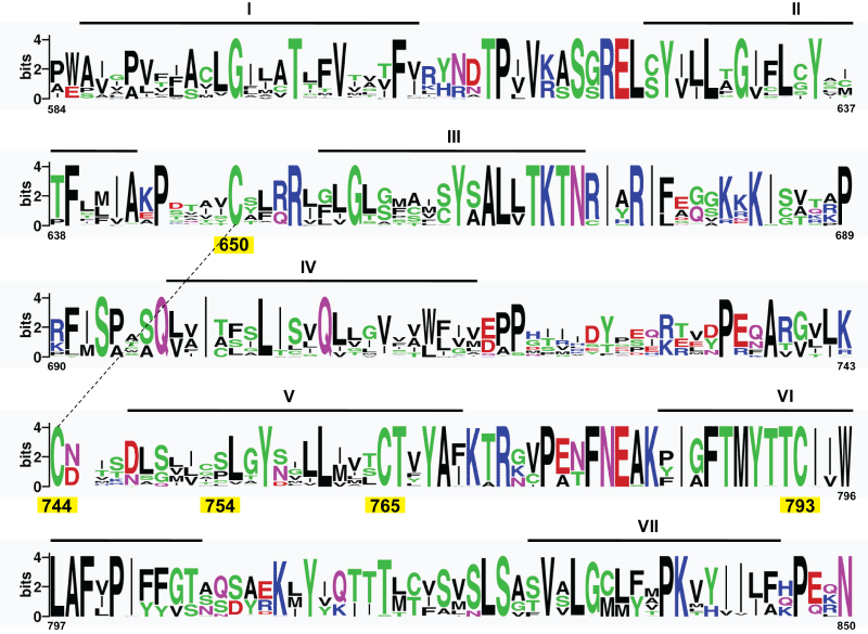 | Figure 1: Multiple sequence alignment of the TM regions of mGluRs. ClustalW was used for the alignment and the figure was generated using Weblogo (http:// weblogo.berkeley.edu). The positions of conserved cysteines are highlighted in yellow. The individual letter height of aminoacid(s) at each position indicates their relative frequencies and conservation in the alignment. The TM helices are indicated as lines above the sequence. |
