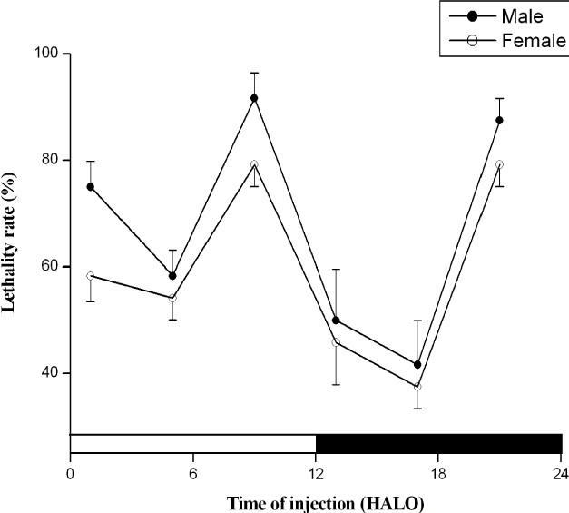 | Figure 1: Variations in tolerance to sodium nitroprusside (6 mg/kg, i.p.) as assessed by the percent of mortality at each of the six circadian dosing times (1, 5, 9, 13, 17, and 21 HALO) in a total of 72 Swiss albino male and female mice aged 2 weeks. Each point represents the mean ± SEM of four independent experiments. The black bar corresponds to the dark period. Maximums of lethality correspond, irrespective to the gender, to drug dosing at 9 and 21 HALO. |