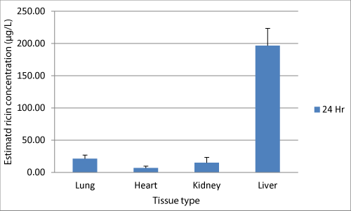 | Figure 1: Ricin detected in tissues after murine exposure to 3LCt50. The figure shows the estimated ricin concentration (μg/L) from tissues where ricin was detected, at 24 hours post ricin aerosol exposure. Bars represent means and standard deviations of 4 replicates. This would indicate that the liver would be the best candidate for post-mortem identification of ricin poisoning. |